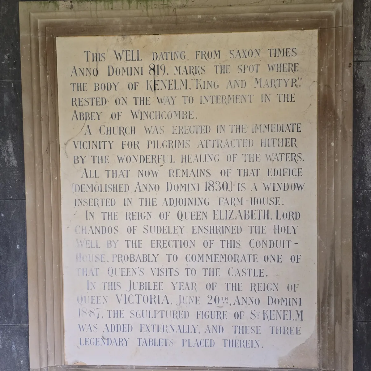 Sometime after, a Chapel of St. Kenelm at Romsley was built beside the spring and a church still remains at or close to the spot of the well. The well itself is now marked with an modern stone wellhead and channel running down to an ugly well head provided by the local Lord. The original well is supposed to be down behind the bricked off doorway on the east side of the church.
